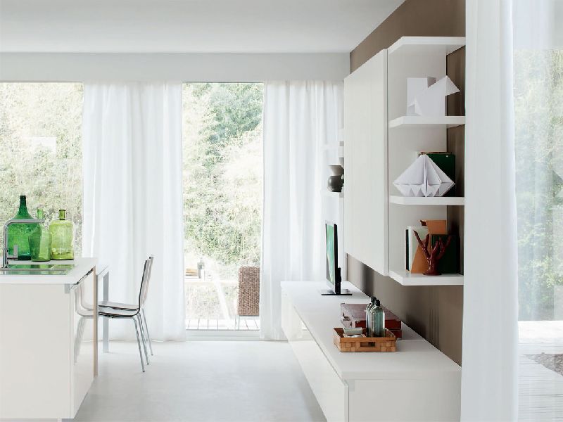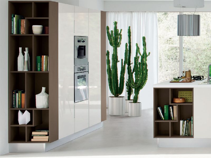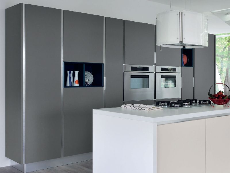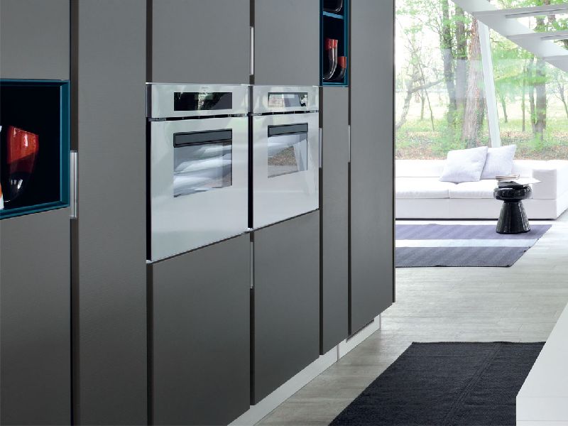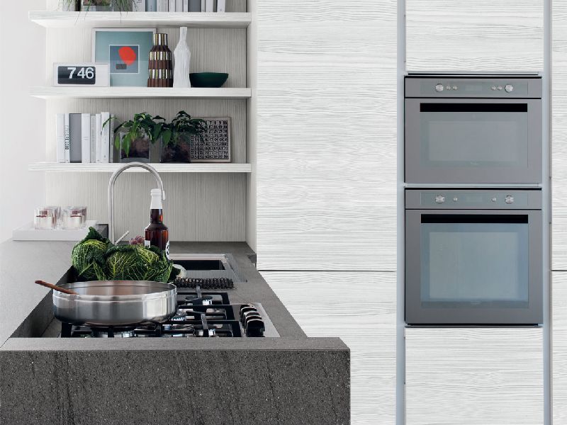 The Essenza kitchen features sober, linear forms and is enriched by the refined tactile and visual character of the wooden finishes, coupled with the numerous color varieties of the doors which brighten up the composition and create a pleasant contrast.