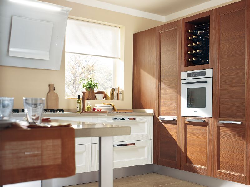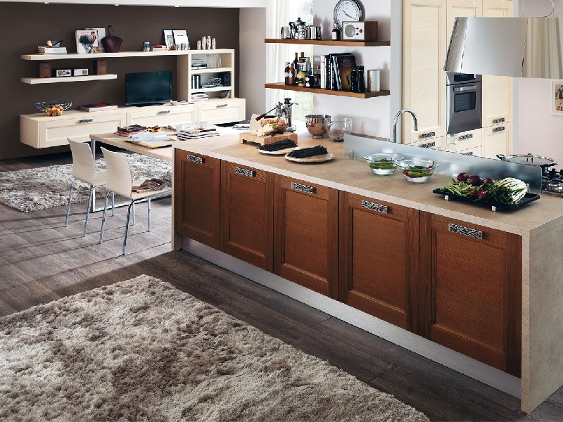 Its roots lie in the craftsman’s tradition: solid, 24 mm thick wood is the absolute protagonist. to create unique settings for a new living concept. A project structured to adapt to various furnishing needs; the kitchen enlarges to become a living area, with wall cabinets and bookcases to divide the space while maintaining harmony and practicality with the warmth of wood in charming, rich tones.